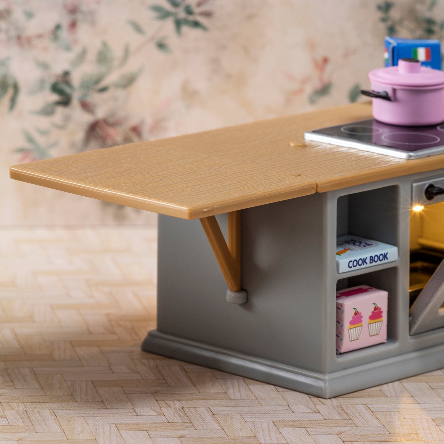 The kitchen island comes with battery-operated LED lights, drawers and doors that open and a folding worktop. Where will you put the kitchen island in your kitchen?